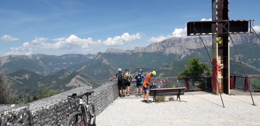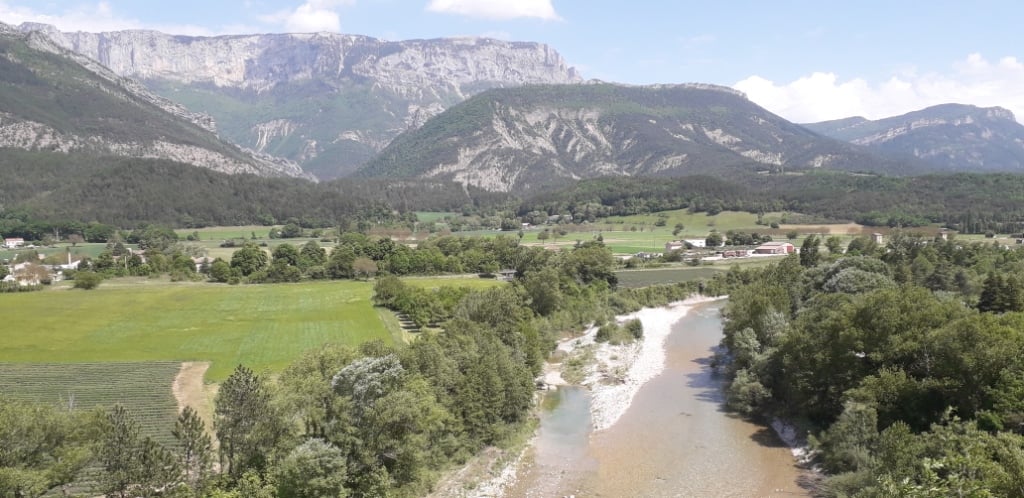 Etaient présents : Pierre, Antoine, Claude, Brigitte, Christian, Bruno, Charley, Brigitte, Bernard et Michel B Les routiers ; Jacques, Jeannot, Rolland et Louis. Pierre a pris le remorque du club avec 6 VAE et un vélo de route. Arrivés lundi, à l’heure du repas au camping, nous avons la surprise de pouvoir disposer de nos bungalows, Juste le temps de nous installer et de nous équiper, nous voilà partis depuis le camping faire un petit tour de mise en condition de 25km qui déjà a été prometteur. La forêt est belle il y a de bonnes montées, mais aussi de très belles descentes sur des petits sentiers. Le tracé du jour comme ceux des jours suivants ont été préparés par François, nous avons plus qu’à les charger dans nos GPS. Paysage autour de Die, la Drôme et le massif du Glandasse au fond.