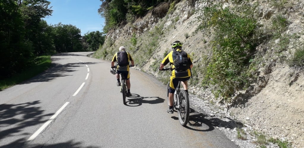 La soirée se terminera par une bodega améliorée, suivie d'un repas de fin de séjour avec tout ce qu'il faut, paella, fromage et dessert. Sans compter la bonne humeur et les discutions animées entre vététistes et les routiers, chacun allant de son anecdote sur le séjour. Nos amis routiers ont également fait de belles et longues sorties dans le Vercors mais aussi dans la Drôme Provençale et comme nous les VTTistes ils ont souffert de cette chaleur un peu trop précoce pour la saison. Nous ne manquerons pas de rappeler qu'il n'y a eu aucune casse ni accident durant ses 4 jours intenses, ni sur les pistes ni sur les routes. Deux chutes sans conséquences une de Charley, tombé à l’arrêt en retournant son vélo et une impressionnante d’Antoine qui a eu le chance d’être retenu par des ronces qui lui ont évité de débouler dans la pente. Merci à Pierre à Claude à Jacques à Brigitte… à tous les participants, à Didier et François qui ce sont décarcassés pour que tout se passe bien et tout c’est vraiment bien passé. Michel Billon