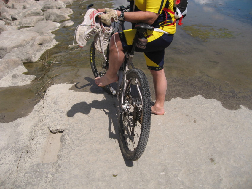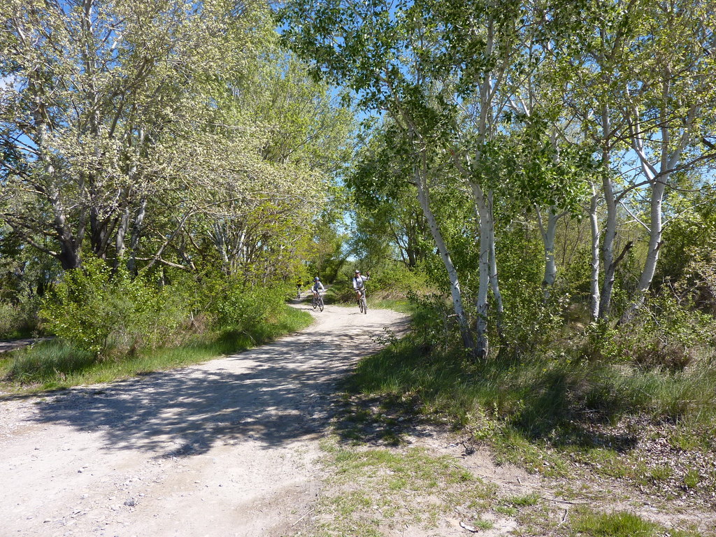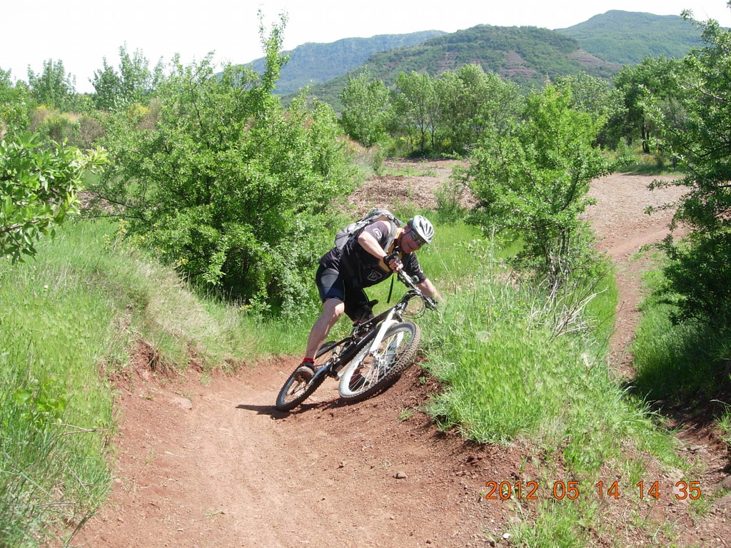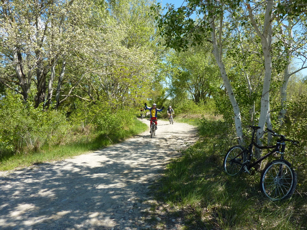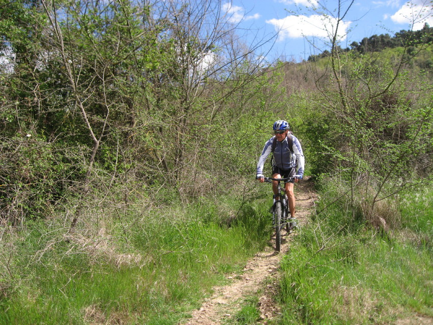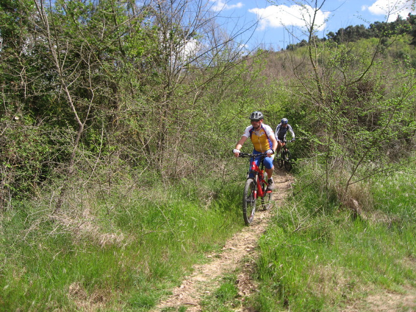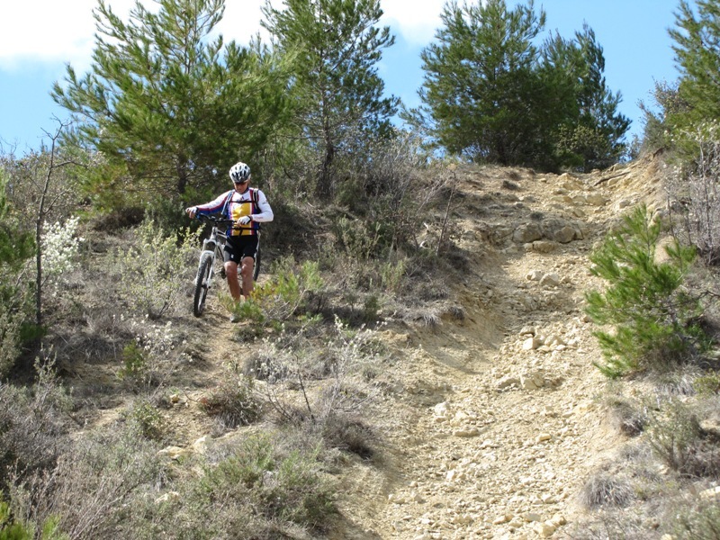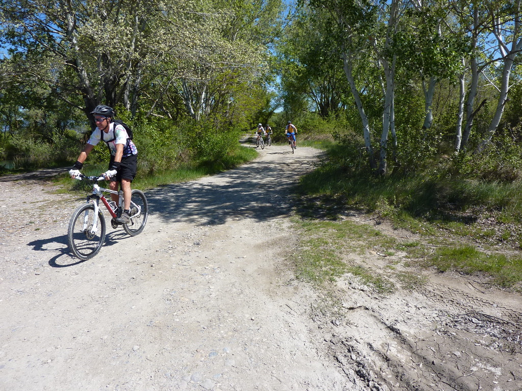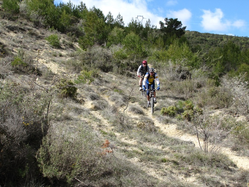 Après cette montée assez cool, deuxième (bonne) surprise, nos amis coudoucéens ont su dénicher sur le plateau tout un tas de nouveaux petits sentiers vraiment rigolos qui me font traverser la D67 (4-termes-Coudoux) puis passer sous le TGV avant de rejoindre une première fois la Touloubre. Singles à gogo : encore une nouveauté avec la très jolie « boucle de Fauchon » (coucou Daniel !) puis plus classiquement à nouveau la Touloubre, les Barons, Camaïsse (coucou Claude !) et le ravito (le pain est excellent !). La remontée vers le plateau jusqu'au pont du TGV emprunte encore de de beaux singles dans les bois de la Bourdonnière. Un peu de flottement sur le plateau où le balisage se fait plus discret (débalisage ?), mais les larges pistes en balcon incitent à la vitesse, avant de pouvoir dévaler sur Coudoux par une piste raide et pierreuse. Une petite chipo/moutarde dans son ¼ de baguette (vraiment excellent le pain !), un petit coup de rosé, mon lot gagné à la tombola sous le bras (un pantalon de survêt' du Conseil Général), et je me dépêche de rentrer à Lambesc pile à l'heure.