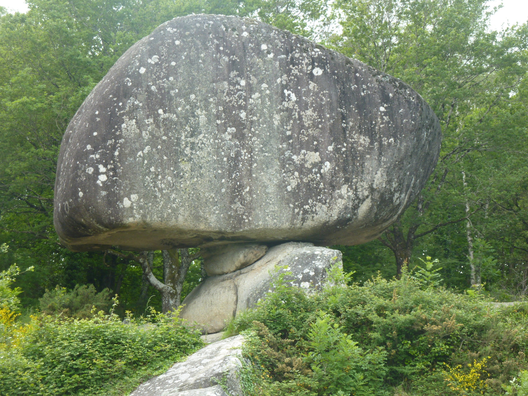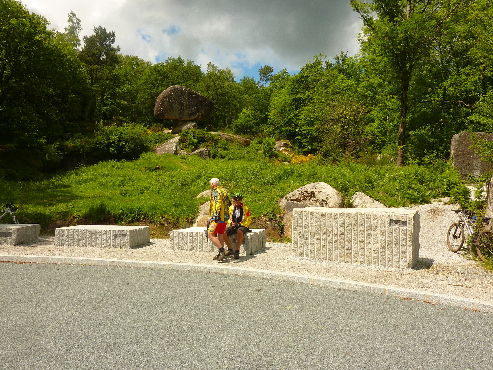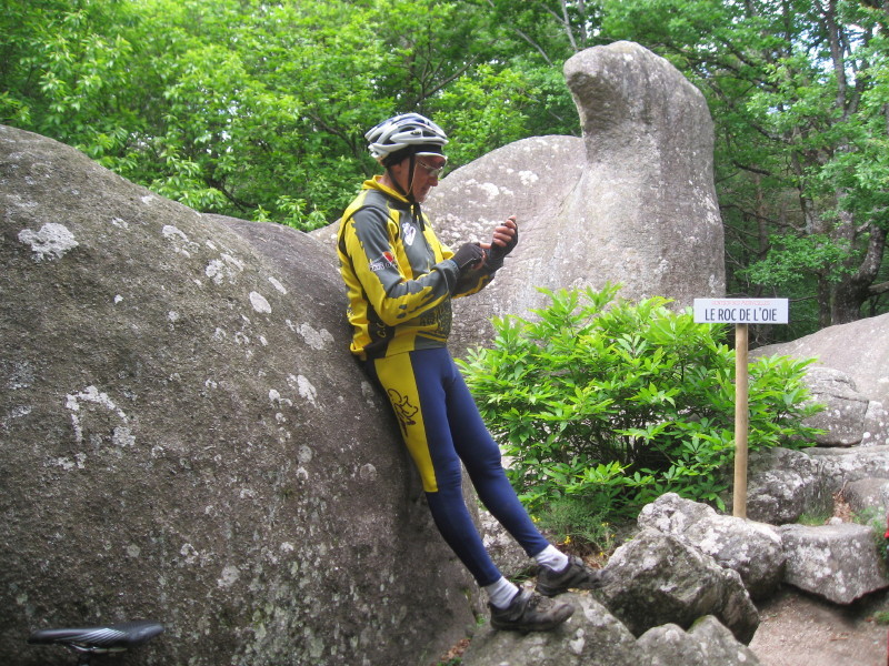 Après 13 kms, nous tournons la tête pour voir des rochers imposants de granit tombés de nulle part en bordure de forêt, et notre ami Gérard V touche la roue avant de Jeannot et se fracasse comme une pierre sur la chaussée. Nous entendons le bruit du casque heurtant le macadam et nous craignons le pire. Il se relève difficilement et vous connaissez le verdict. Gérard tient, malgré ses 3 côtes cassées, à terminer le parcours avec nous, certains cyclistes sont aussi courageux que des rugbymans au combat.