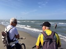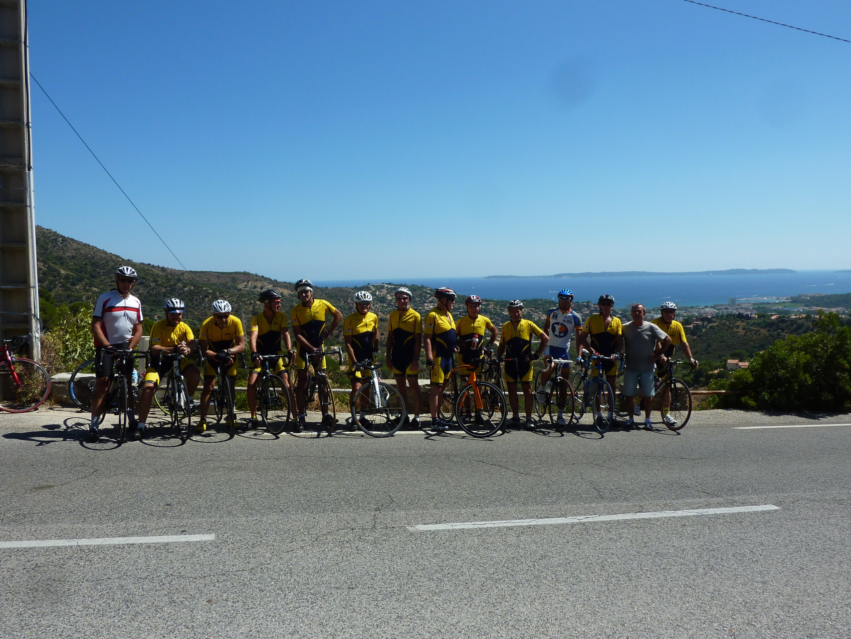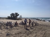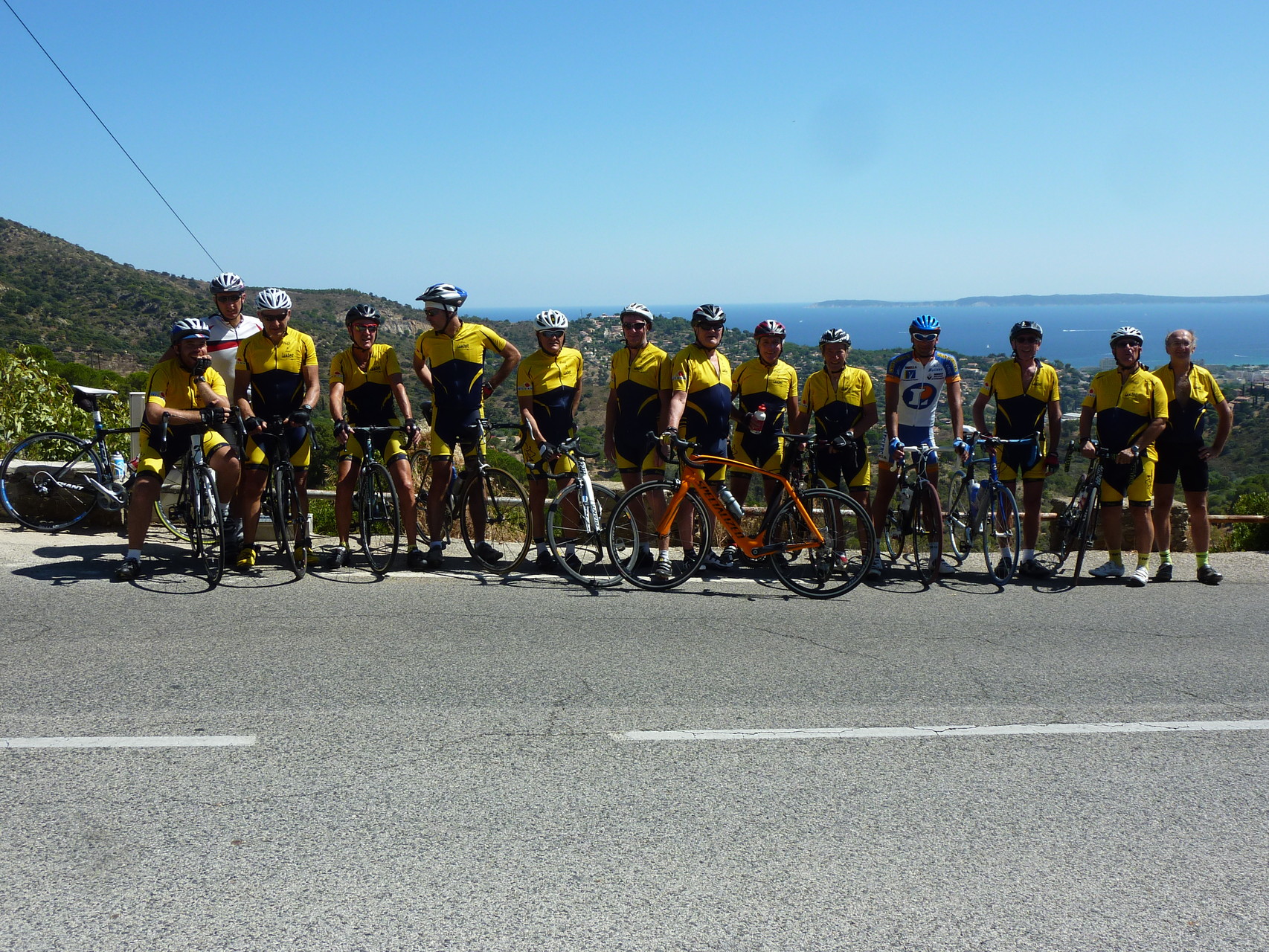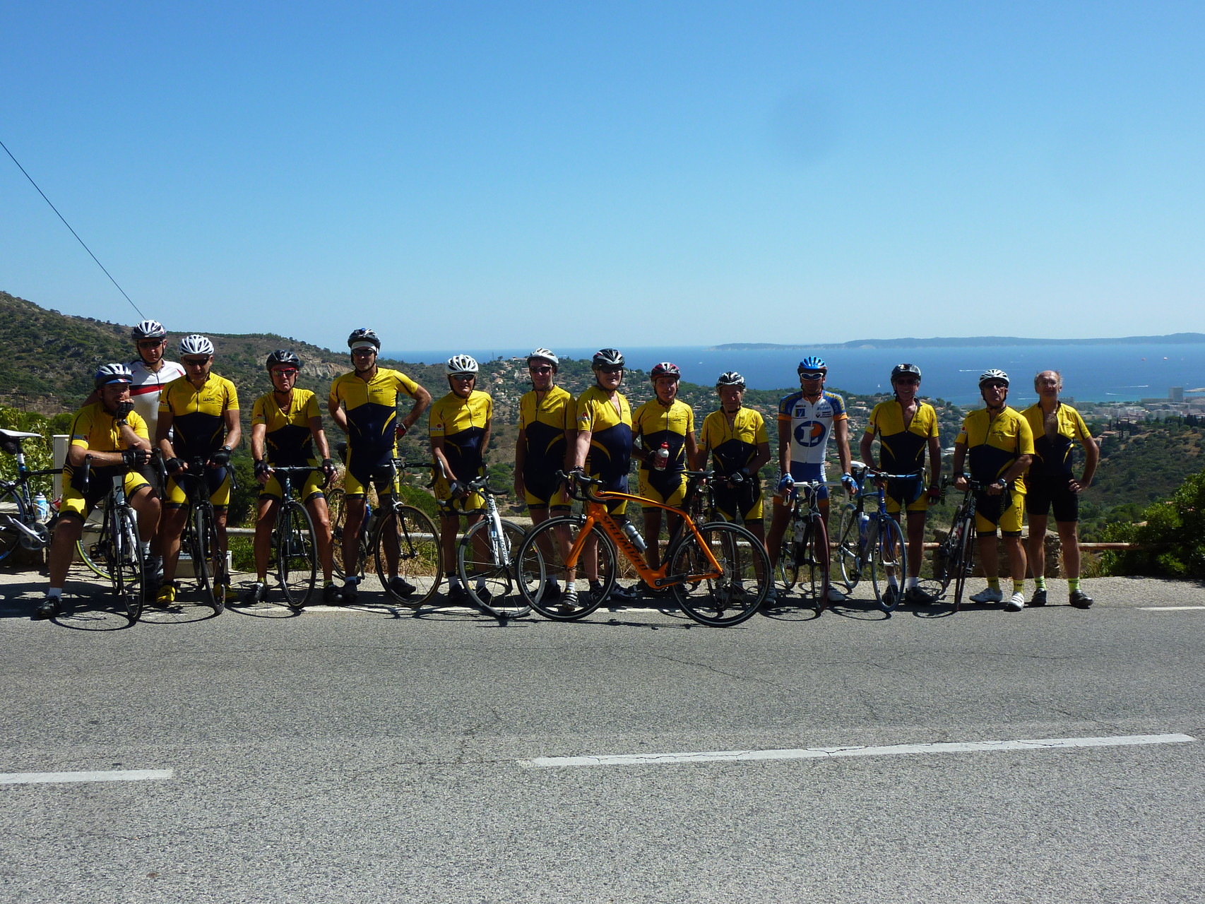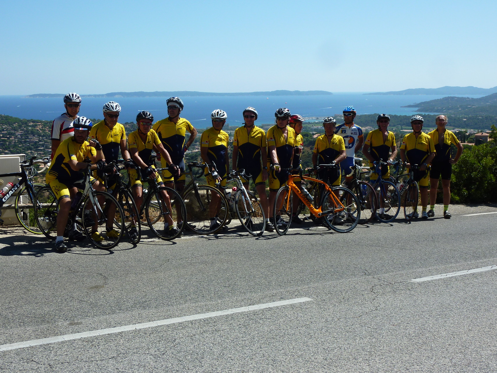 Les taons nous ont lâché et nous pouvons enfin faire la photo devant la baie du Lavandou, avant de mettre un terme à notre périple chez Helios Plage, où la baignade dans une mer à 25 °, les bières, le vin de pays, les pavés de bœuf et les dorades, nous font oublier tous les efforts fournis.