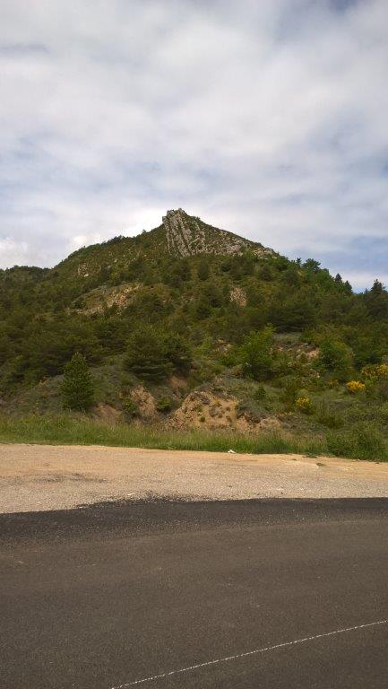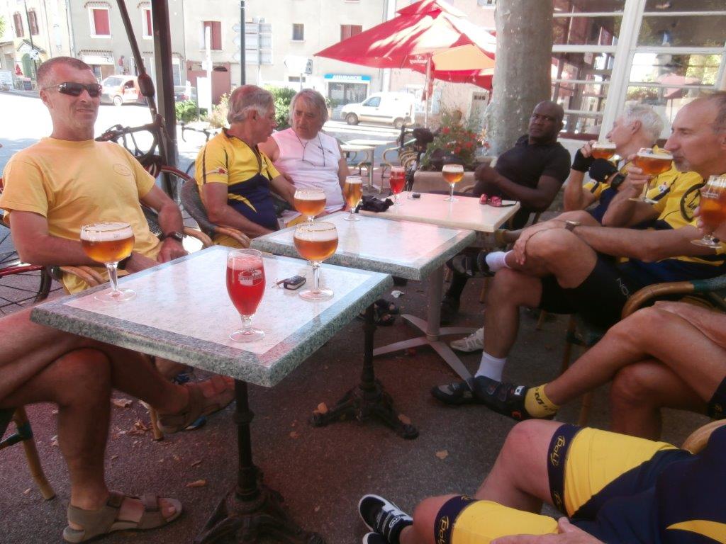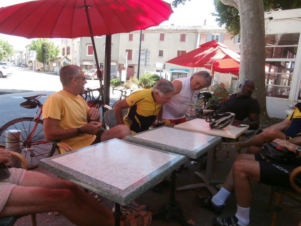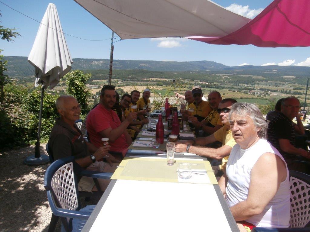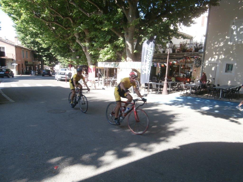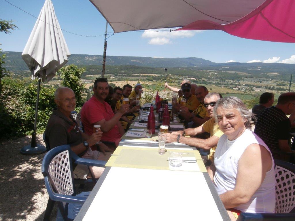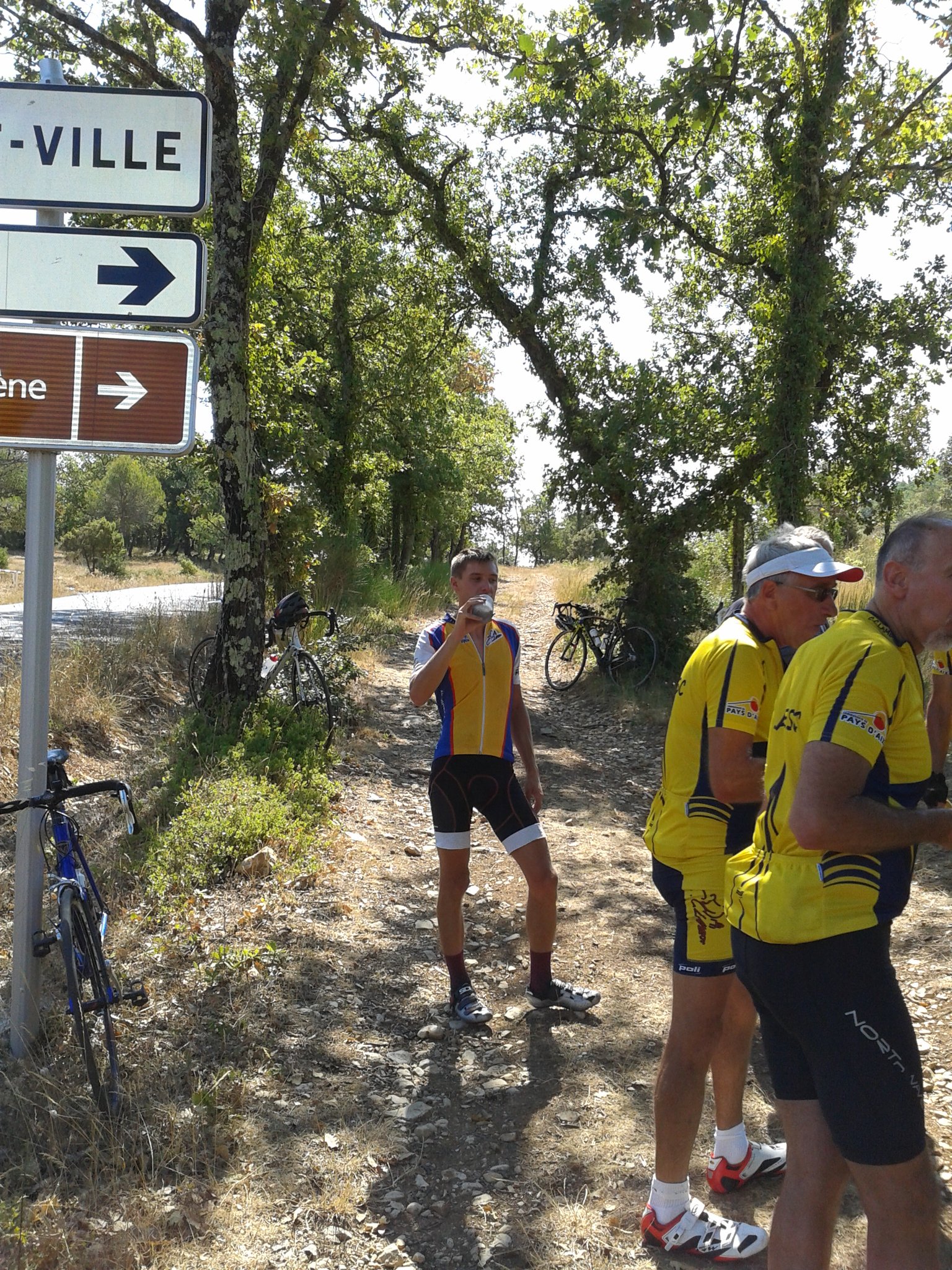 Nous dévallons sur Monbrun les bains dans une féerique descente avec vue sur le versant nord du ventoux ( arrèt obligatoire pour photos ) de 10 km à 7 / 8% .arrivée à Montbrun à 14h ( seulement 63 km au compteur et déjas 1100m de dénivelé + ) petite collation ici car les villages passés étaient déserts et sans cafés ,mais aussi sans voitures pendant parfois 5km ou 15 min, par ici nous roulons sereins avec en prime parfois une 3ème voie de circulation pour cyclistes ( vestige de la guerre froide du temps ou les 18 missiles transcontinentals français implantés ici et la nécessitaient un entretien suivie du réseau sur de larges routes solidement bitumées (missile nucléaire oblige )