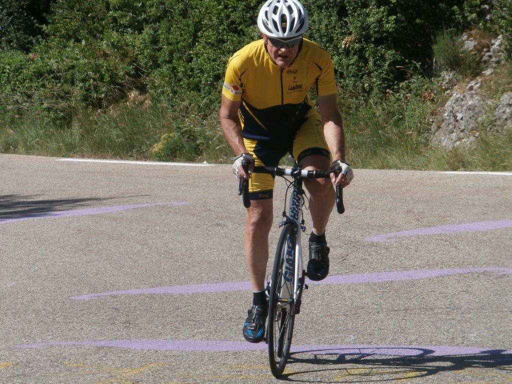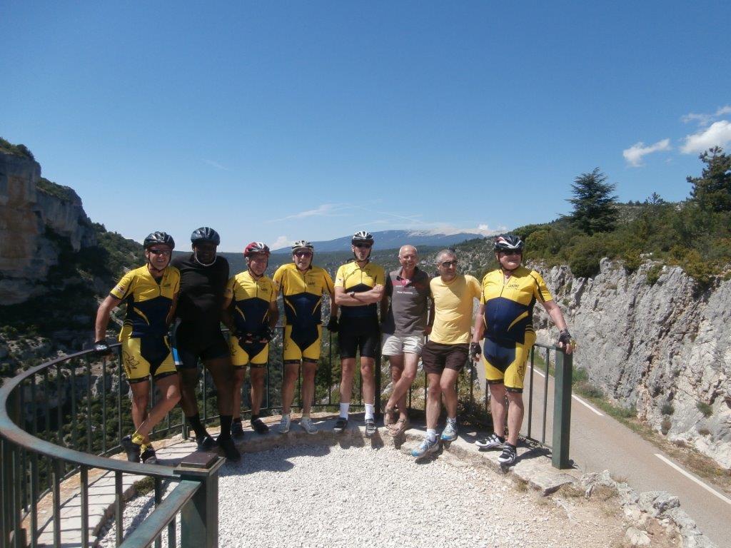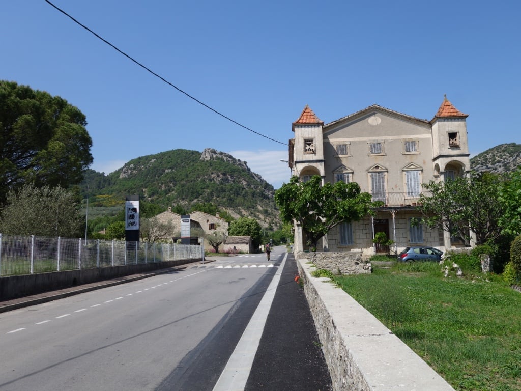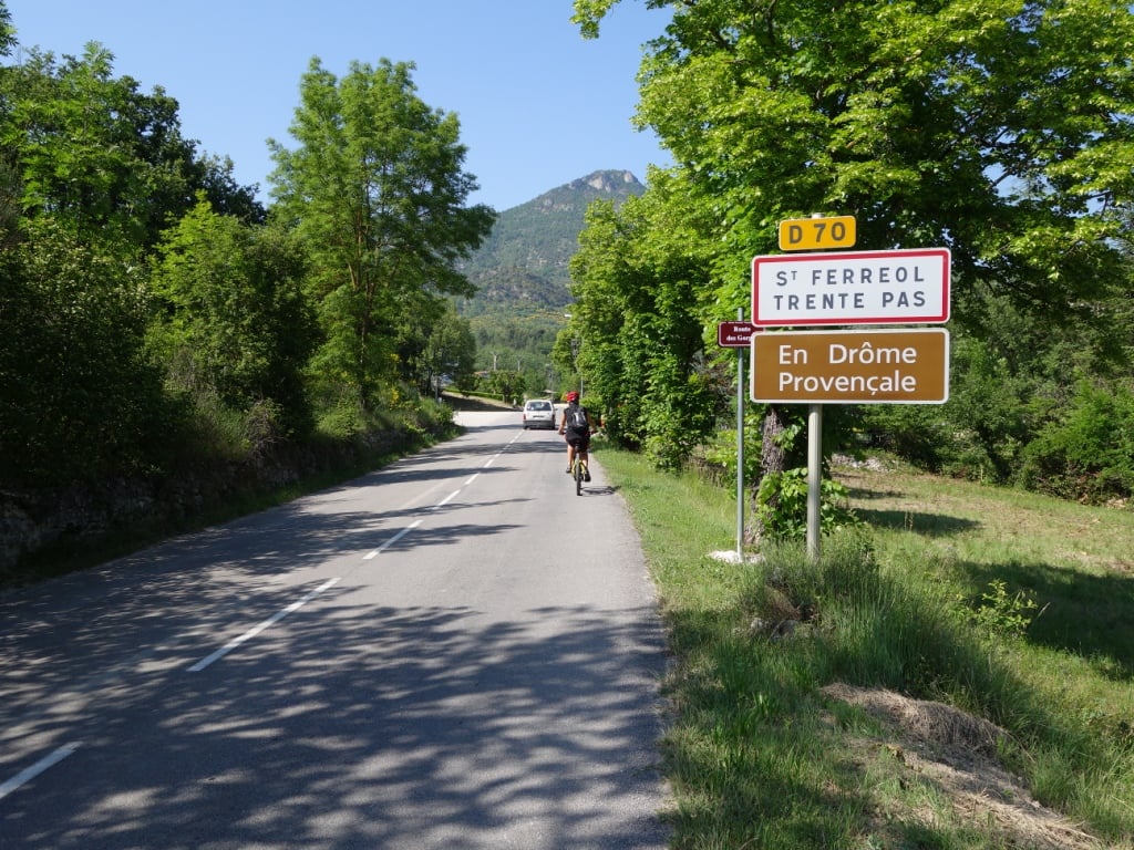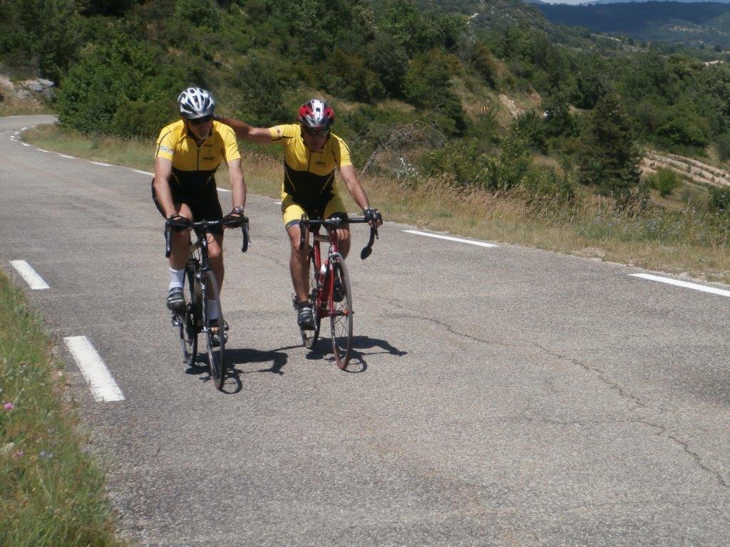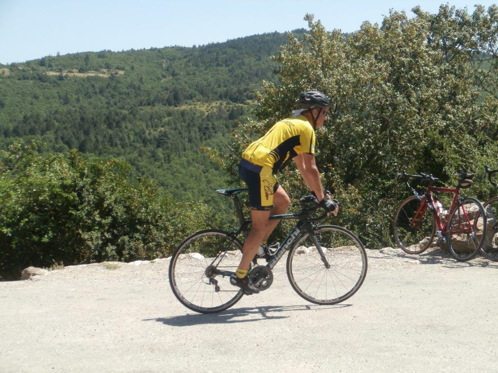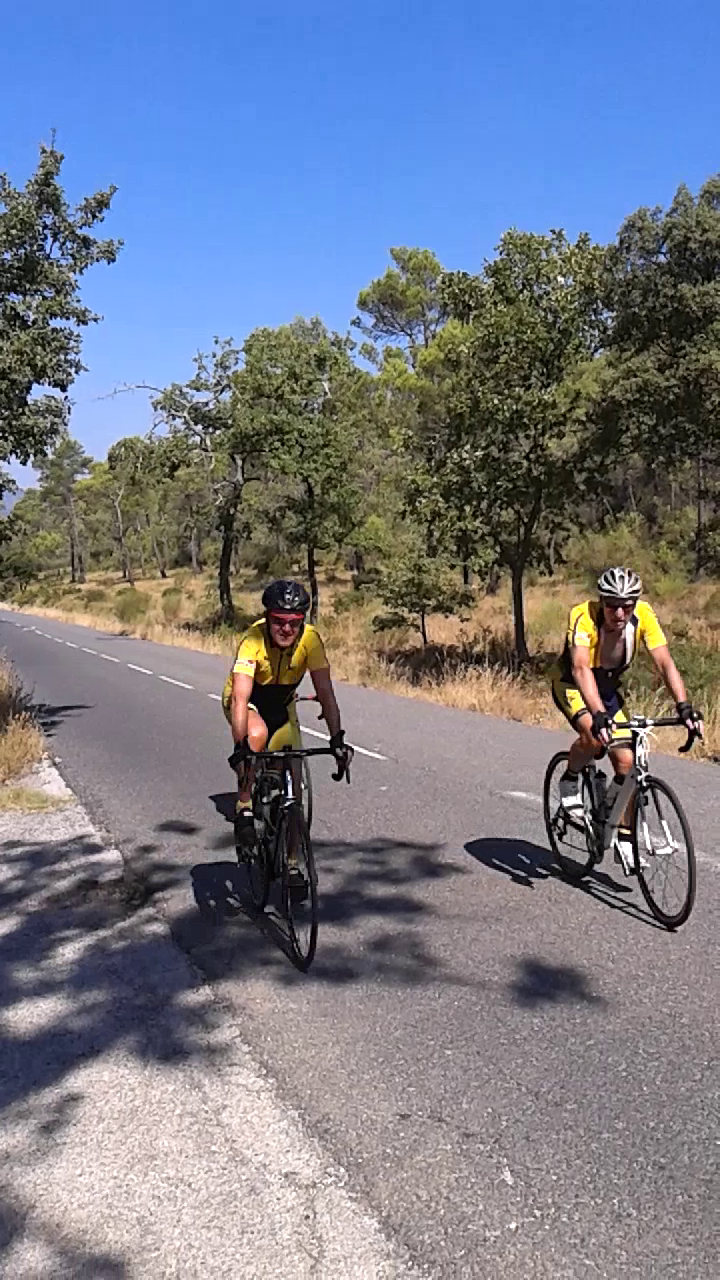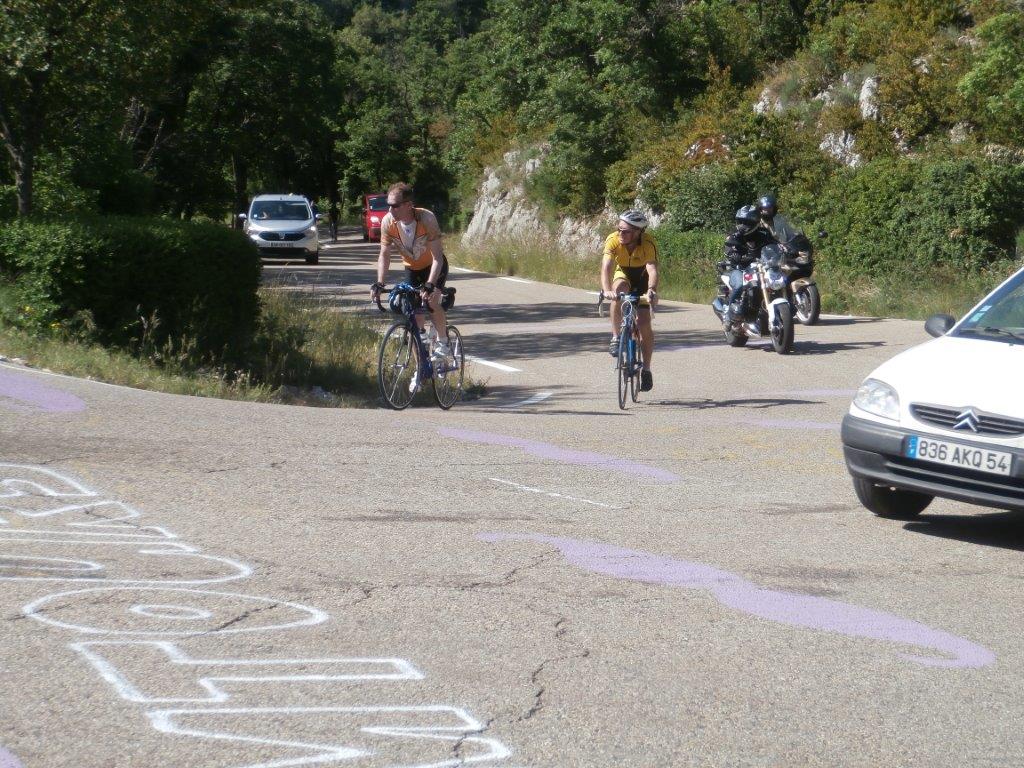 Nous dévallons sur Monbrun les bains dans une féerique descente avec vue sur le versant nord du ventoux ( arrèt obligatoire pour photos ) de 10 km à 7 / 8% .arrivée à Montbrun à 14h ( seulement 63 km au compteur et déjas 1100m de dénivelé + ) petite collation ici car les villages passés étaient déserts et sans cafés ,mais aussi sans voitures pendant parfois 5km ou 15 min, par ici nous roulons sereins avec en prime parfois une 3ème voie de circulation pour cyclistes ( vestige de la guerre froide du temps ou les 18 missiles transcontinentals français implantés ici et la nécessitaient un entretien suivie du réseau sur de larges routes solidement bitumées (missile nucléaire oblige )