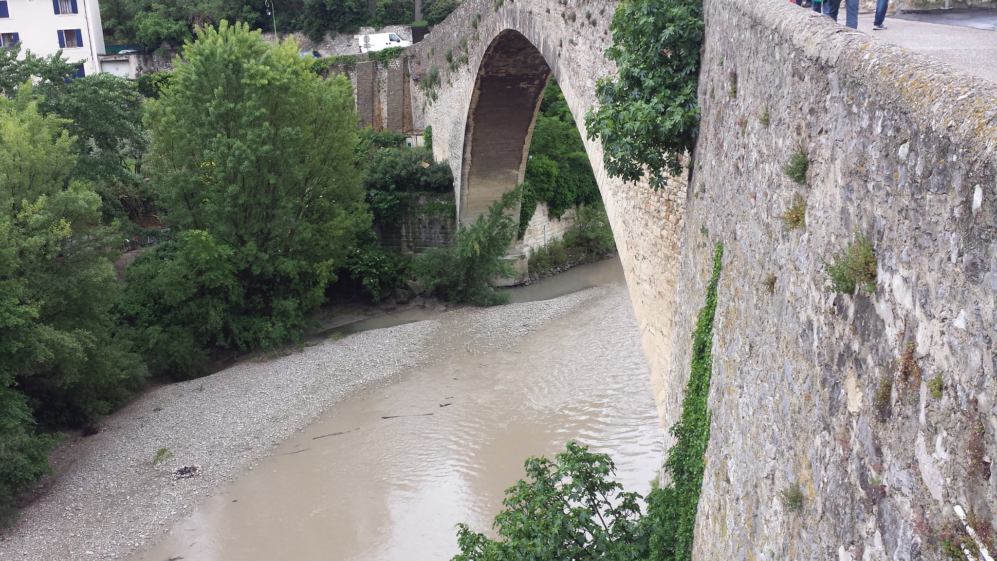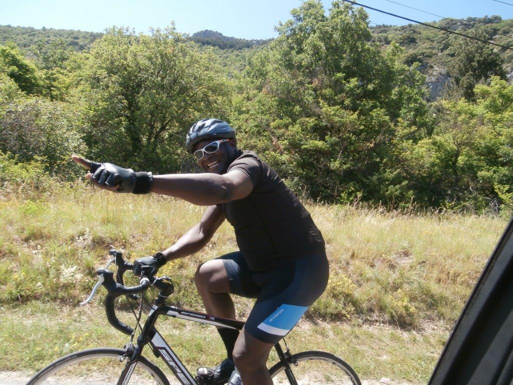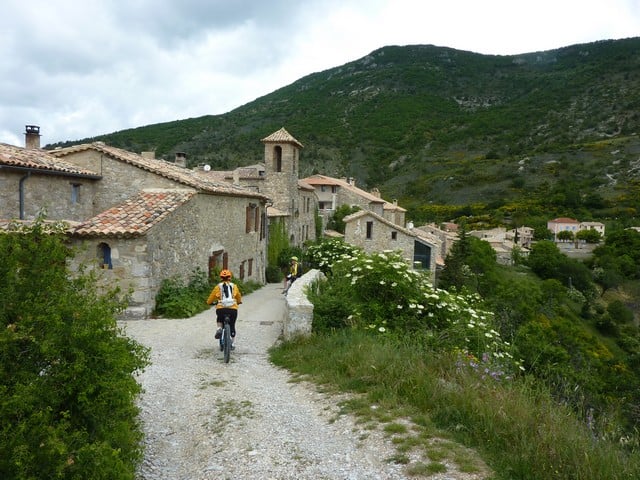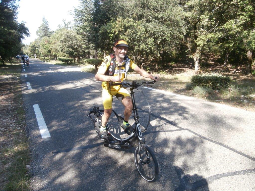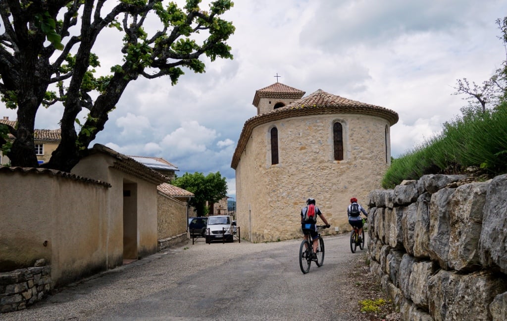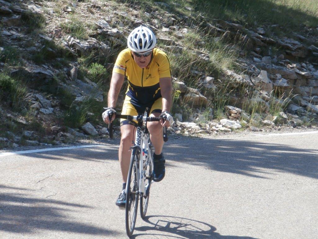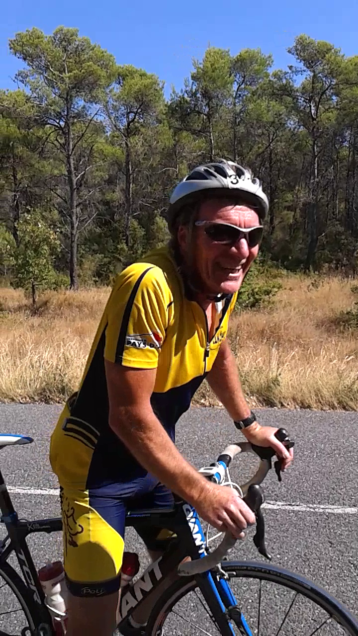 Nous dévallons sur Monbrun les bains dans une féerique descente avec vue sur le versant nord du ventoux ( arrèt obligatoire pour photos ) de 10 km à 7 / 8% .arrivée à Montbrun à 14h ( seulement 63 km au compteur et déjas 1100m de dénivelé + ) petite collation ici car les villages passés étaient déserts et sans cafés ,mais aussi sans voitures pendant parfois 5km ou 15 min, par ici nous roulons sereins avec en prime parfois une 3ème voie de circulation pour cyclistes ( vestige de la guerre froide du temps ou les 18 missiles transcontinentals français implantés ici et la nécessitaient un entretien suivie du réseau sur de larges routes solidement bitumées (missile nucléaire oblige )
