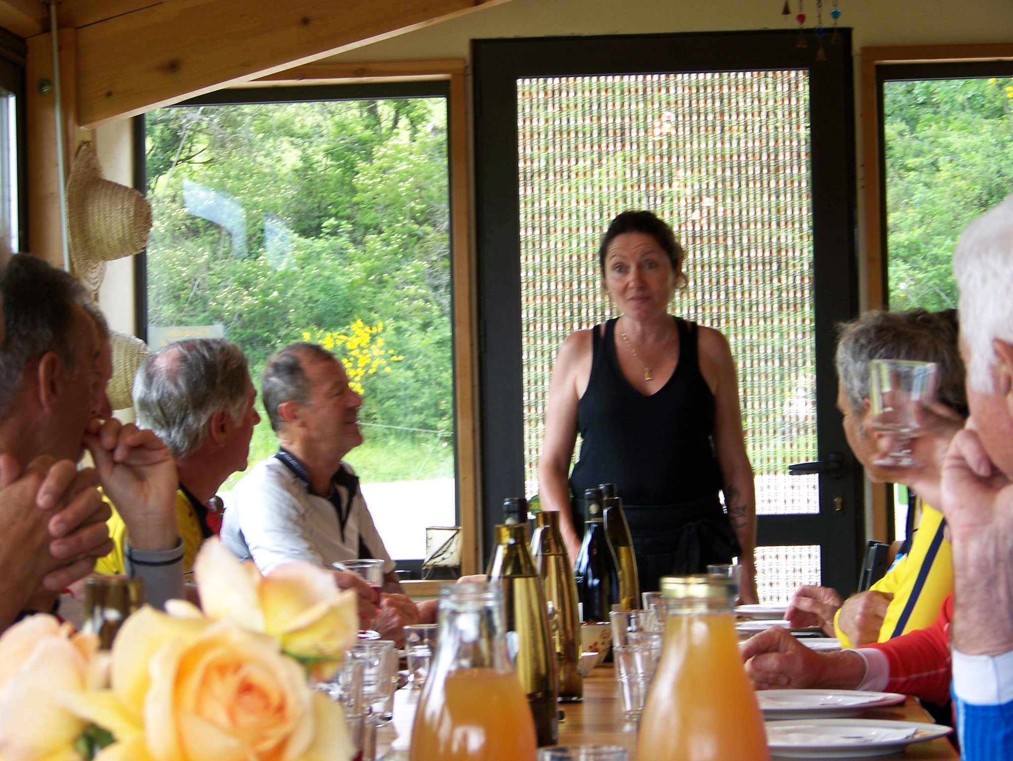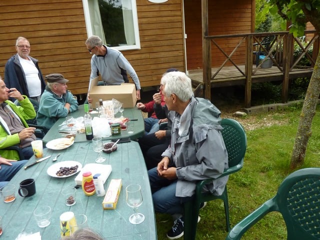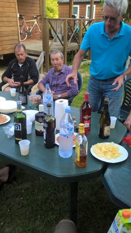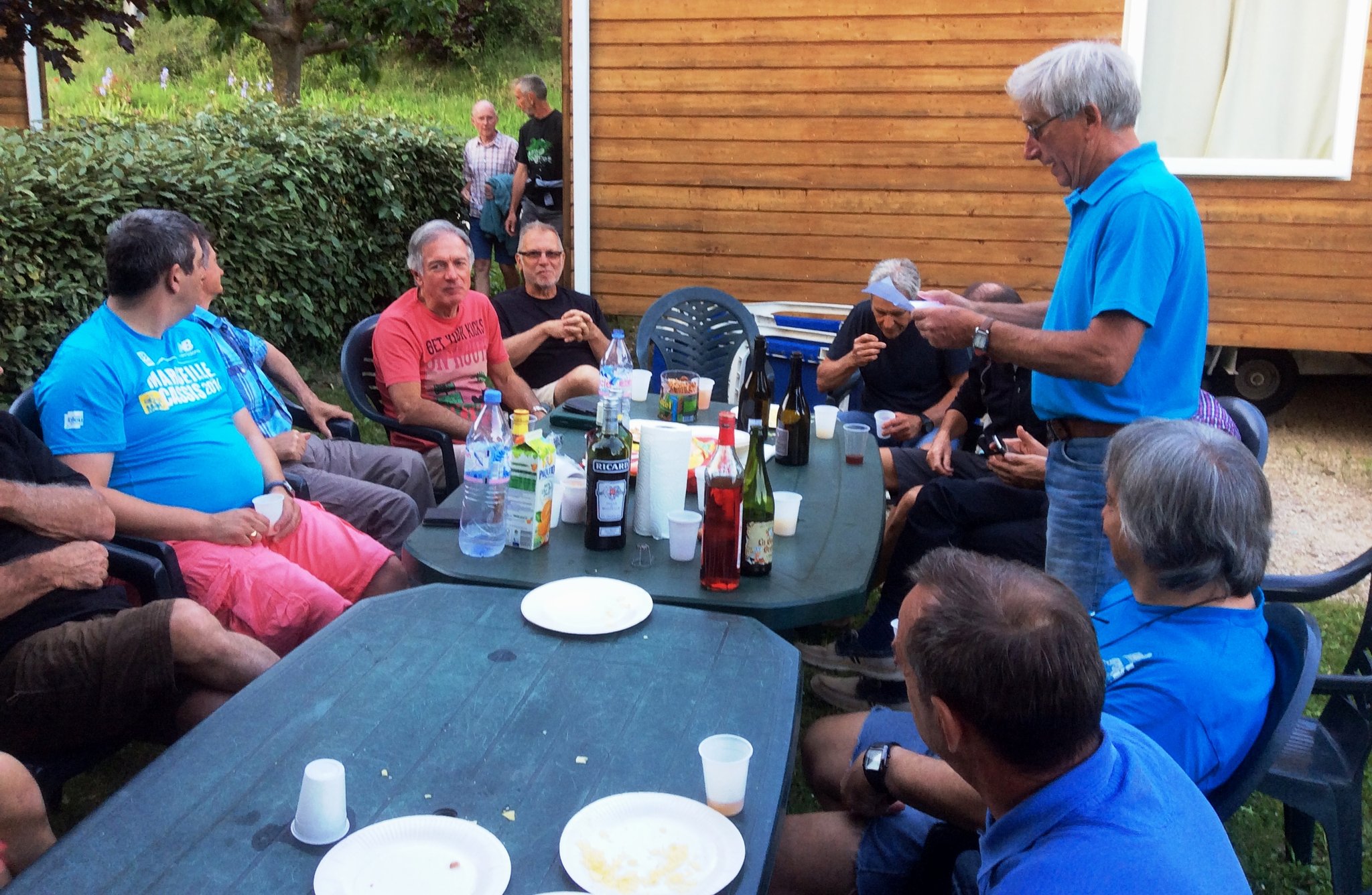 Heureuse surprise, c'est l'anniversaire de Jean Marie qui fête ses 68 printemps et nous offre le Champagne. On commence à grignoter lorsque l'ami Daniel arrive par le col de Cèze, s'il vous plait, et sur son beau vélo de route Giant, sans assistance électrique.