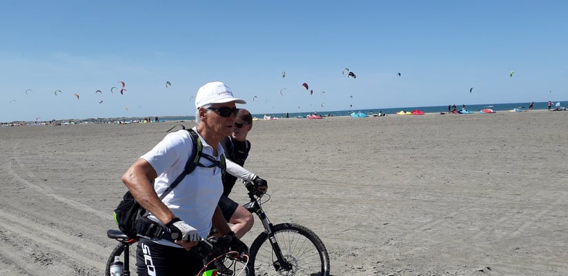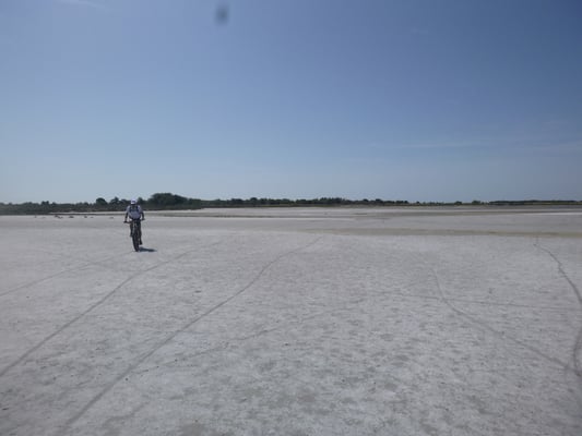 Une petite pensée au départ pour notre ami Charley qui, avec son traitement, ne peut pas trop aller au soleil et ce matin le soleil brille mais un petit vent frais nous permet de rouler très agréablement....Les marais sont asséchées vers le départ mais vers Beauduc la mer a emportée les digues et le beau parcours de Claude est impraticable. Il a beau essayé --il y a beaucoup d'eau et de boue et on s'enfonce dangereusement.  La mer a repris ses droits et le phare de Beauduc est maintenant sur une île, inaccessible.