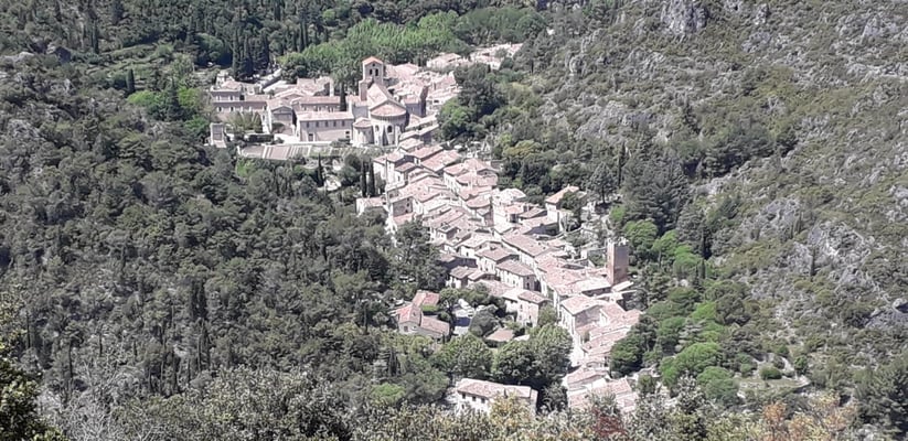 Qui eût cru que nous aurions mangé en terrasse lorsque nous avons commencé notre périple ce matin. Tempé 6° à Vinon et ciel voilé. Mais au cours de la matinée tout s'arrange et les conditions deviennent agréables. Dans la montée vers le plateau des Lavandes, Gérard S nous montre qu'il a retrouvé la forme. Les grandes lignes droites vers Valensole et Puymoisson sont avalées gentiment en groupe. Nous rejoignons Moustiers (photo) et abordons la difficulté du jour à savoir une côte de 2,5 kms mais avec une pente entre 14 et 16%. Chacun son rythme, le premier sera Daniel C parti en éclaireur pour faire des photos. Finalement l'attente ne sera pas trop longue, preuve que tout le monde est bien. Reste à parcourir une douzaine de kms pour rejoindre Ste Croix et donc le Resto. Après ce repos réparateur il faut remonter sur 2 kms ( pas évident après Souris d'Agneau où Hamburger où autres...) . Le plus dur ayant été fait le matin, l'allure est rapide car route descendante et vent favorable, nous rejoignons Allemagne en Provence où nous sommes stoppés par une crevaison présidentielle avec de plus blessure au doigt. Après réparation du pneu et de l'index, cap sur Gréoux. Nous sommes doublés par une dizaine de cyclos de Manosque, mais le CCL emmené par Gérard S et Daniel C  ne s'en laisse pas compter et nous roulons à 40 à l'heure voir plus par moment jusqu'à Gréoux. Séparation avec nos nouveaux amis qui partent vers Manosque. Nous rejoignons Vinon ( voitures et bière ) après 105,5 kms, 24 de moyenne
